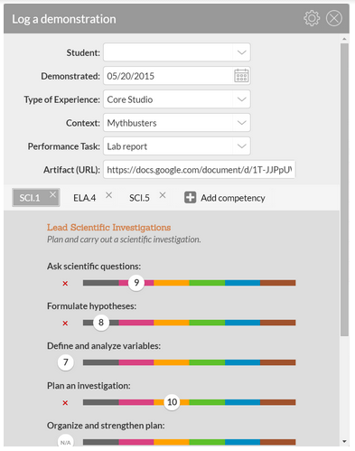 Gaffey worked with Jarvus to create a version of Slate that allows students to complete “studio” projects and track the competencies that those projects hit upon. Teachers have access to their own dashboard that acts as a progress monitoring tool and a competency-based gradebook. For example, let's say that a science teacher is leading a "Mythbusters" project, where students have to lead a scientific investigation. A teacher can "log a demonstration" (see picture below), and define a task that has multiple competencies in the same content area as well as different content areas.